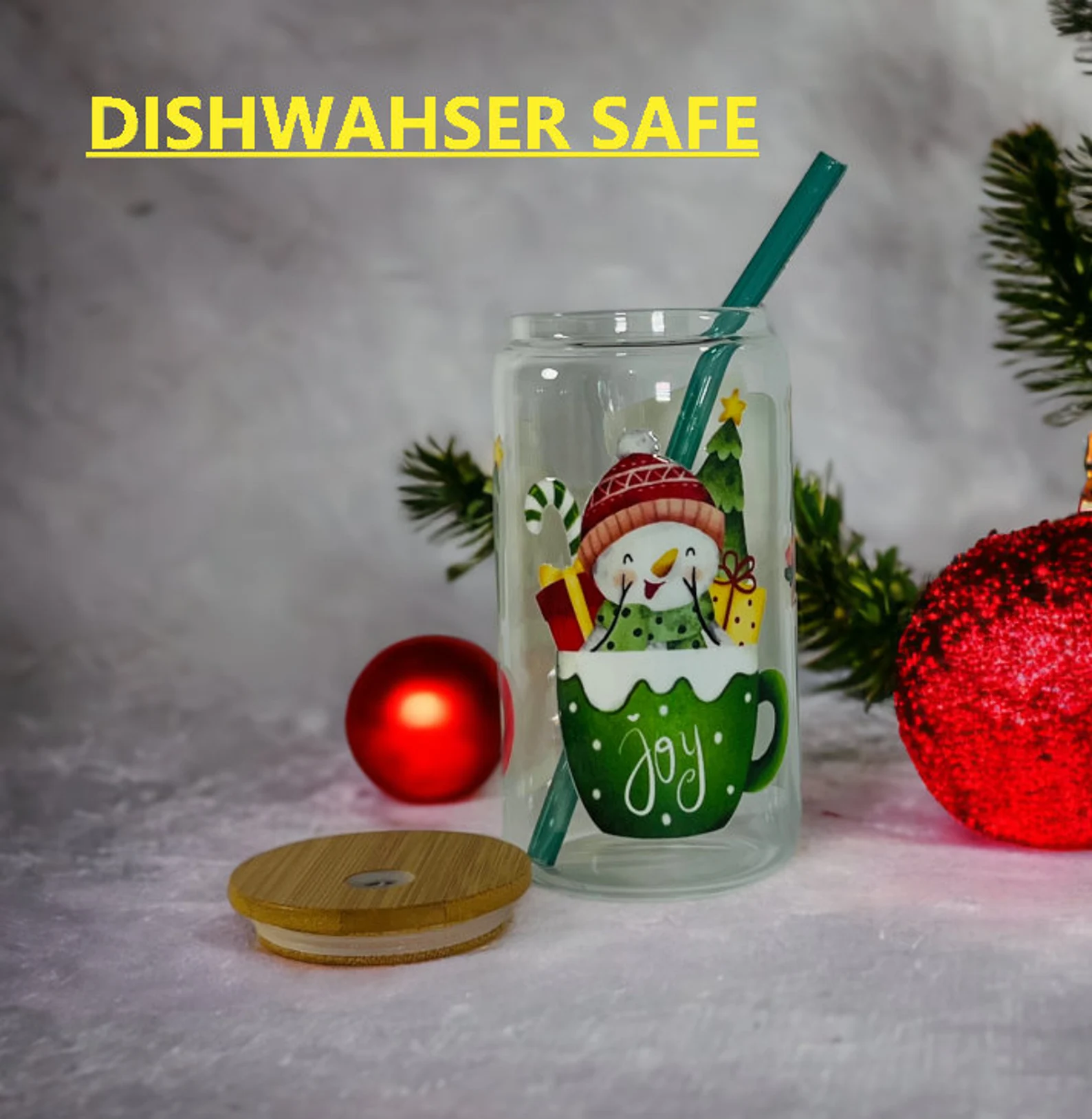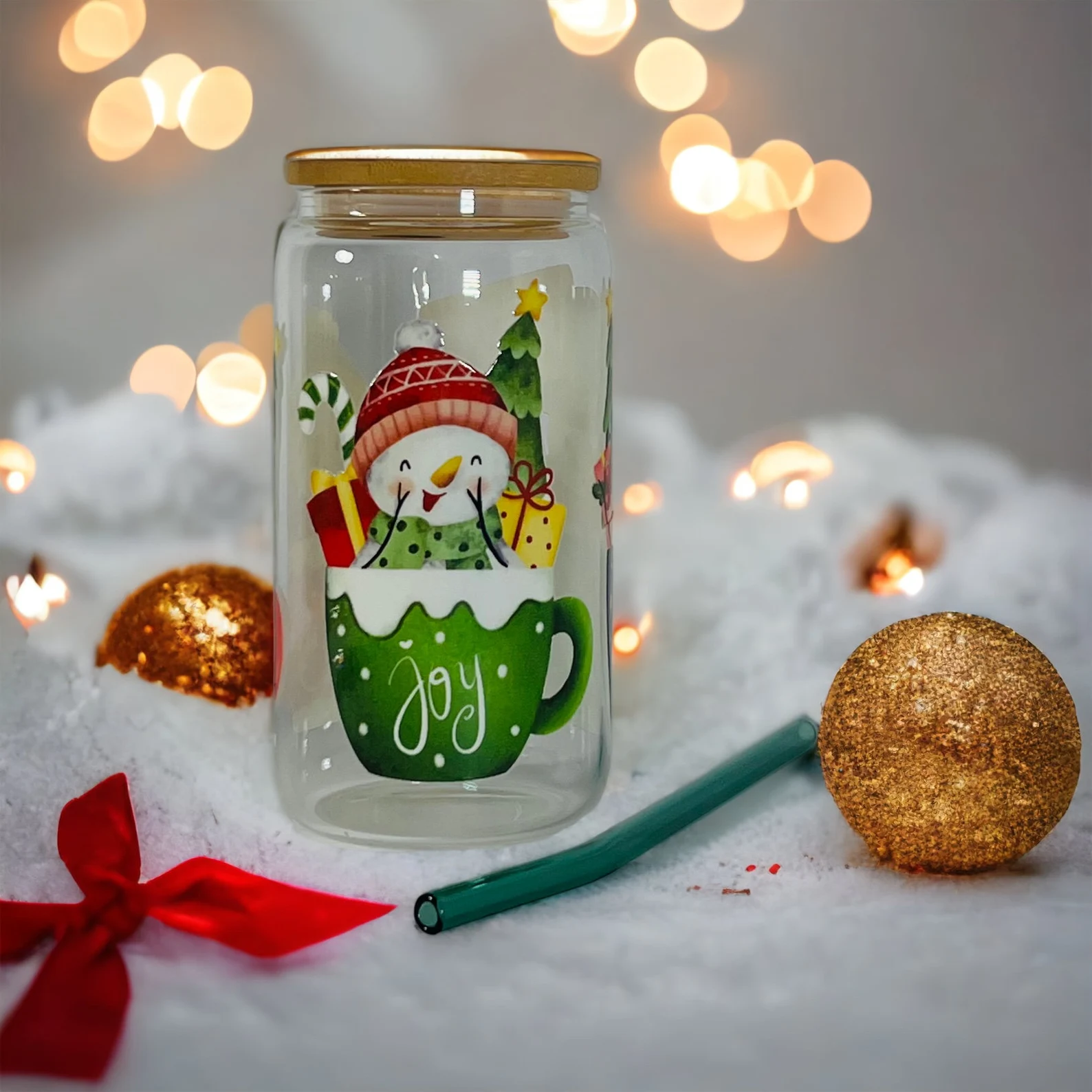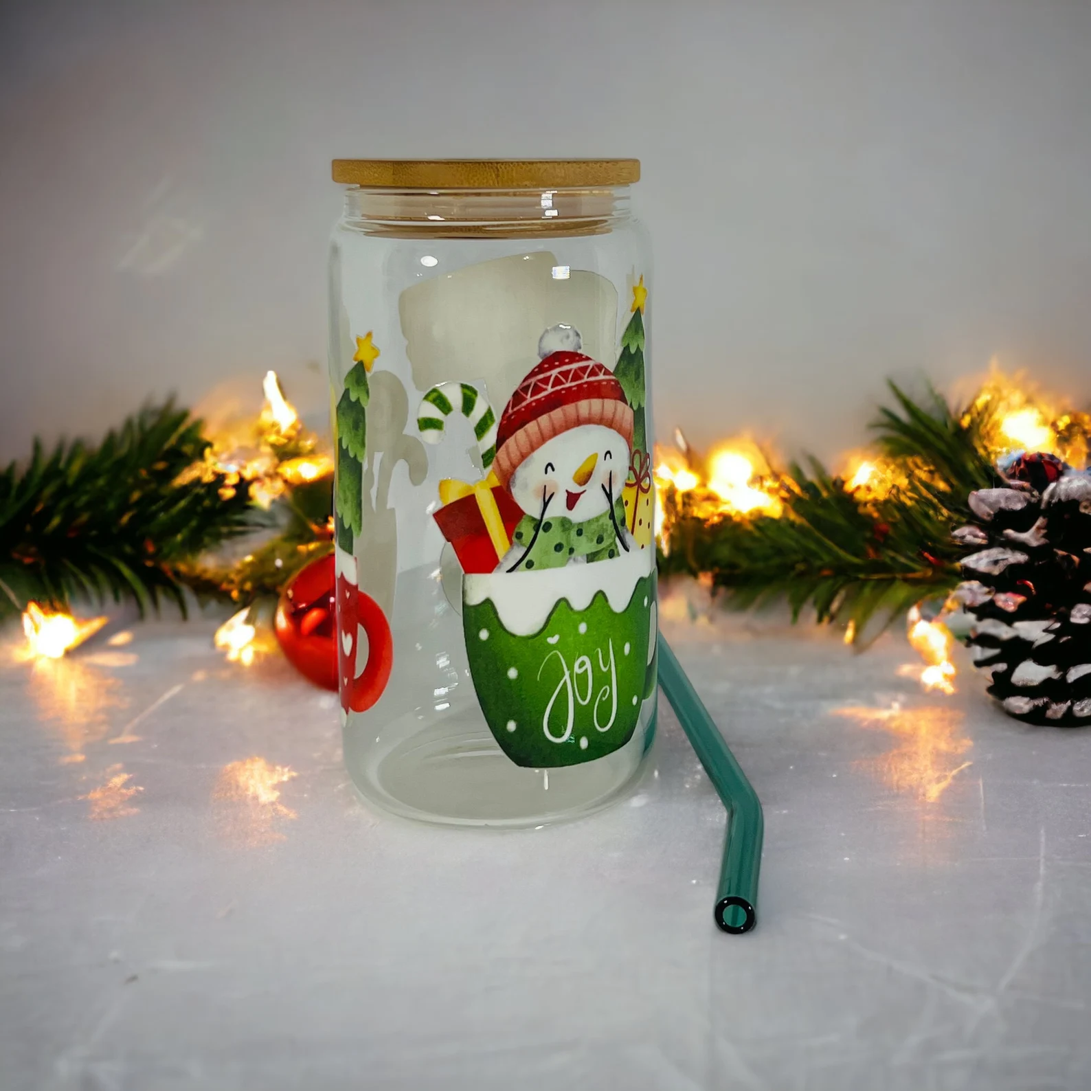 This 16 oz Christmas glass is a sleek and modern vessel designed to hold a generous portion of refreshing iced coffee, boba, lemonade, milk tea, you name it!